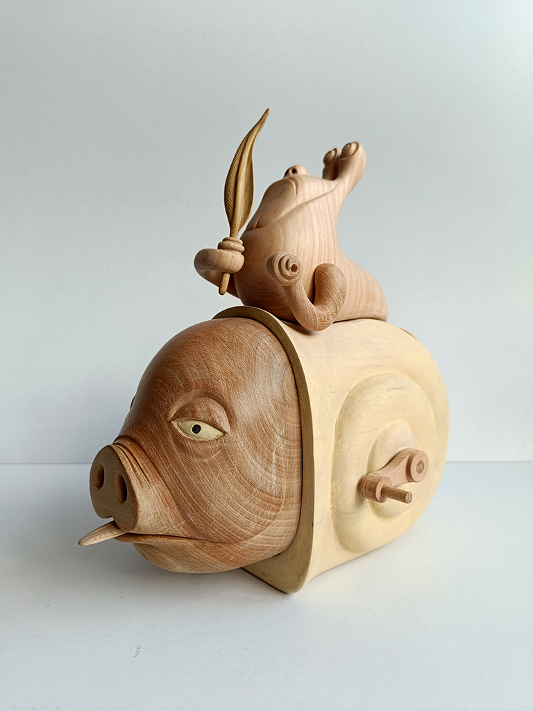 This sculpture is a proof of friendship between species. A perfect symbiosis between a snail and its friend, the pig. The sculpture is made from a combination of beech, cherry and linden wood.Dimensions: 28/28/16 cm